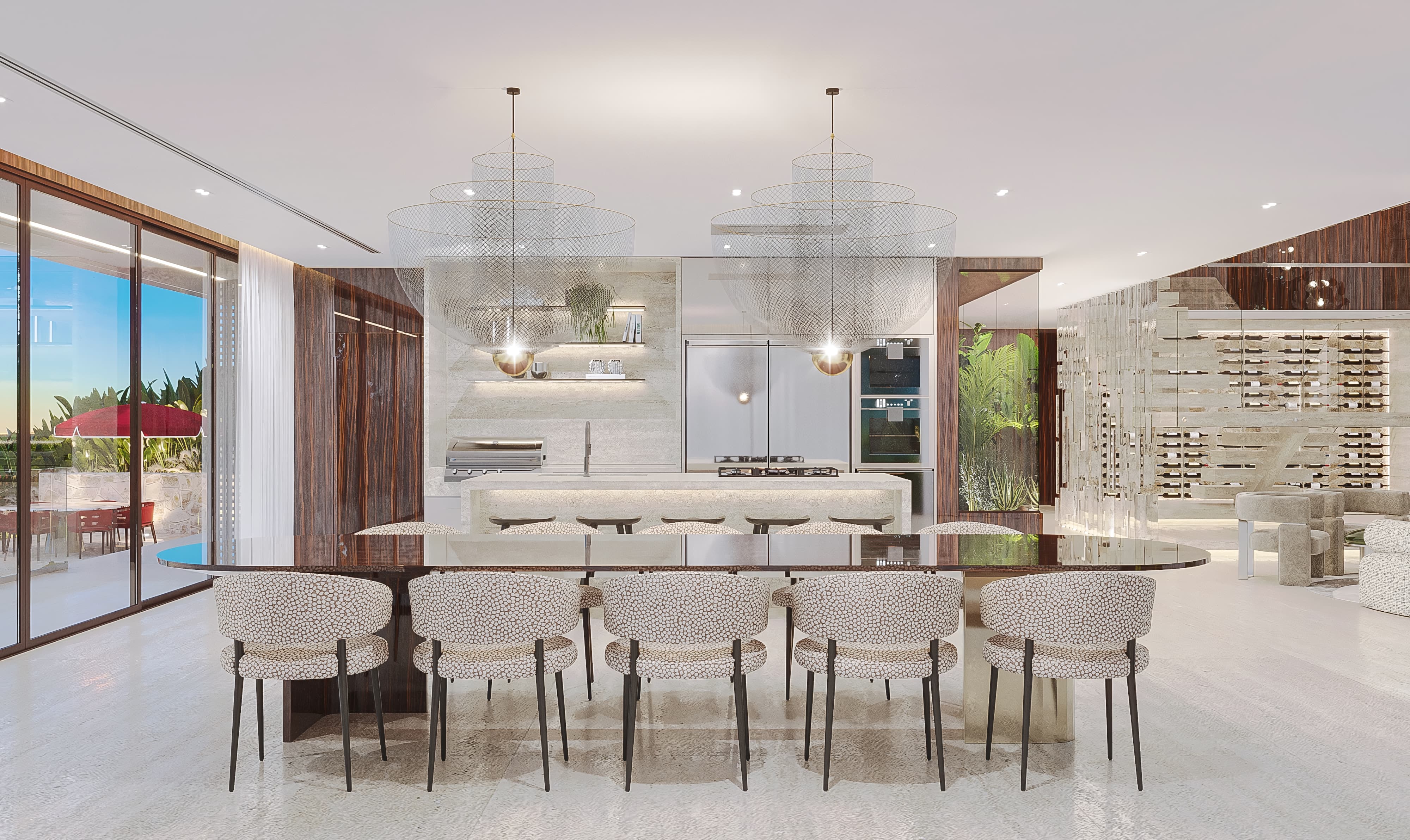 A ampla sala de estar, marcada pelo pé-direito duplo e pela escada escultural em mármore travertino, é banhada por luz natural que atravessa os grandes panos de vidro, conectando o interior ao paisagismo exuberante do exterior.